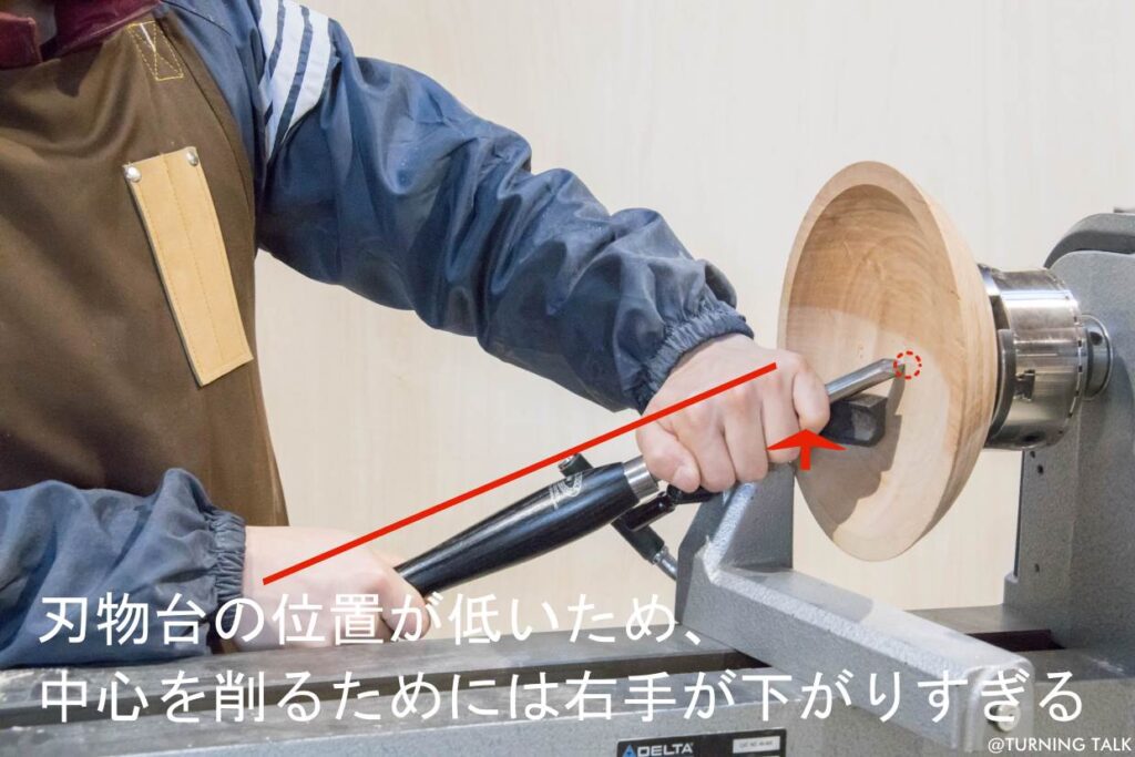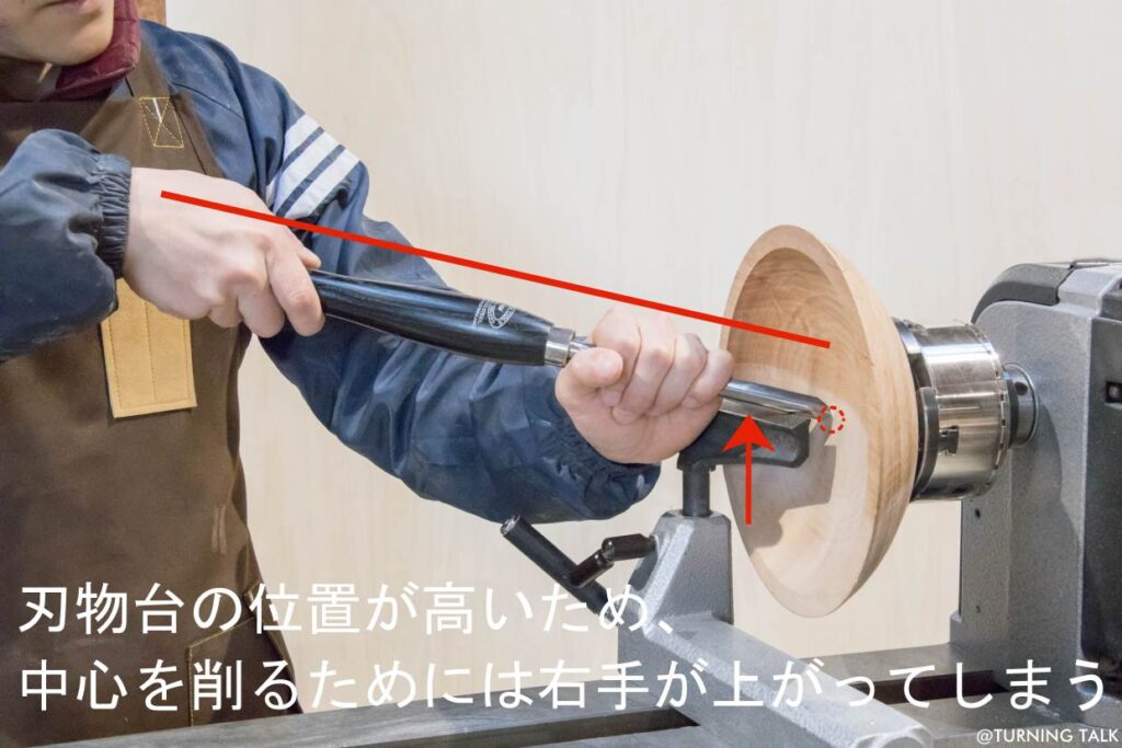 初心者の方の多くは、刃物台(ツールレスト)の高さについてあまり重要視していないように見受けられます。しかし、刃物台の高さはとても重要で、正しくセットされていなければ、あたるべきところに刃先を持って行けず、無理に持っていこうとすると構えがおかしくなるなど、これでは上手に削ることはできません。