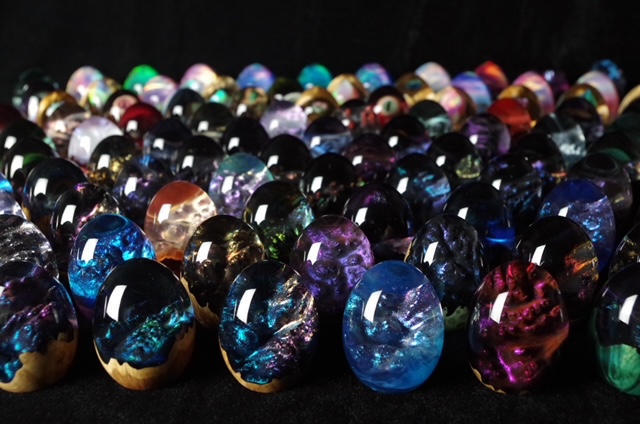 m.a. woodさんの作品は、木材とレジンを組み合わせ、たまご型に削り出されます。ひとつひとつ同じものはありません。木材の選別とレジンの色の組み合わせ、そして内部の模様づくりこそが作家としてその世界観を表現する最も重要な工程になります。そういう意味では、たまご型に削り出す工程は重要ではあるけれども、可能であれば短時間で済ませたい作業です。