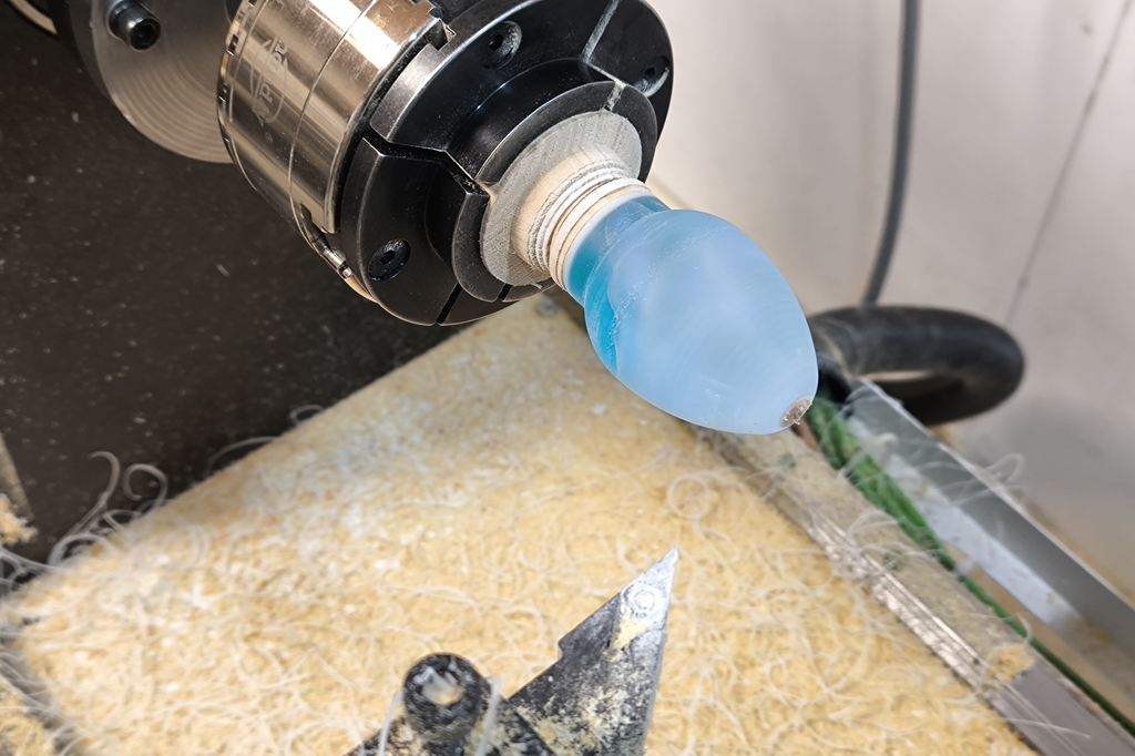 聞くと木工旋盤でひとつひとつ削っていた時に比べ一つ削り出す時間は10分の1だそうです。年間600個、月に50個。1日に1個~2個だった生産量が、大幅に増えそうです。10倍になった生産スピードだけがメリットではなく、そのひとつひとつが同じクオリティで削り出せることにCNC木工旋盤の利点があります。