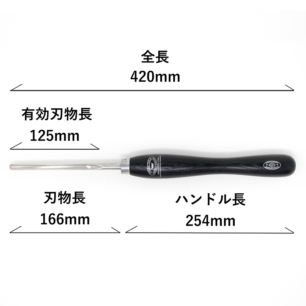 | 呼びサイズ | 3/8 inch ※標準的なスピンドルガウジの刃物径が12mmに対して、本商品は9.5mmです。より細やかな作品作りに重宝する細身のスピンドルガウジです。 |
