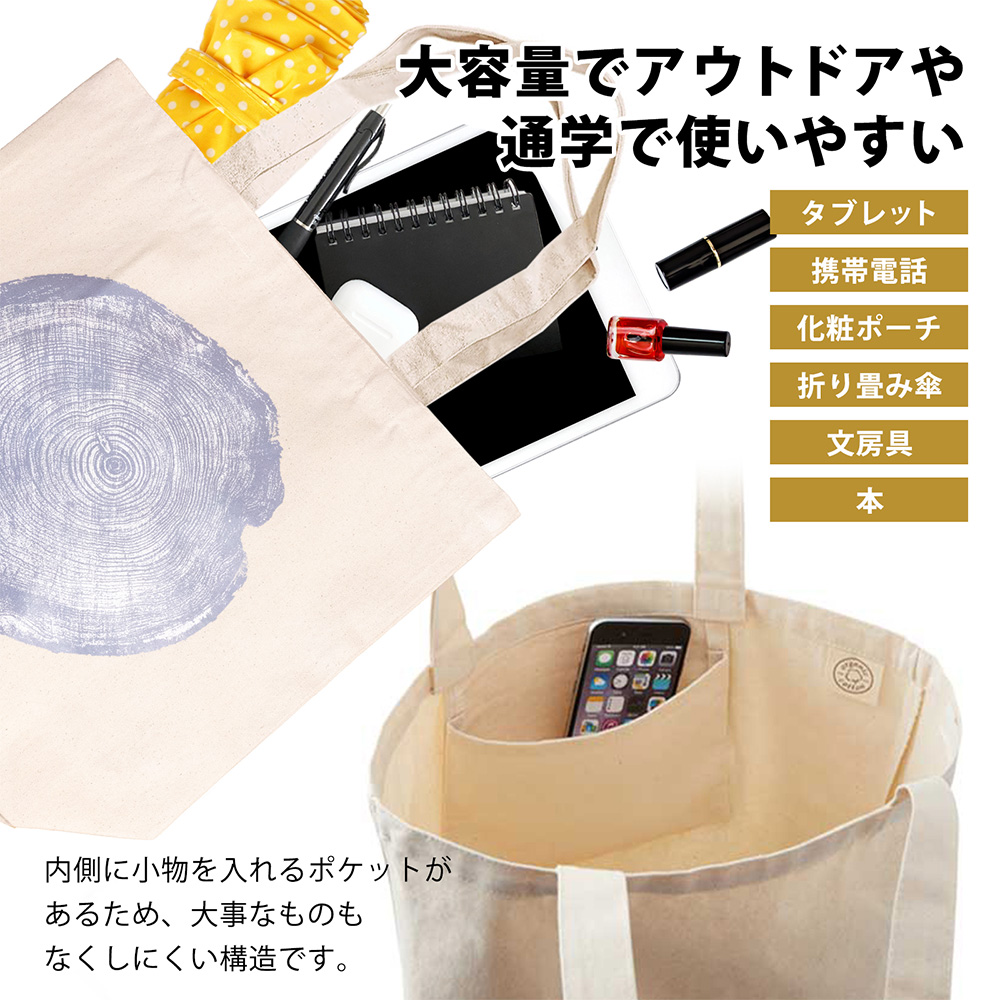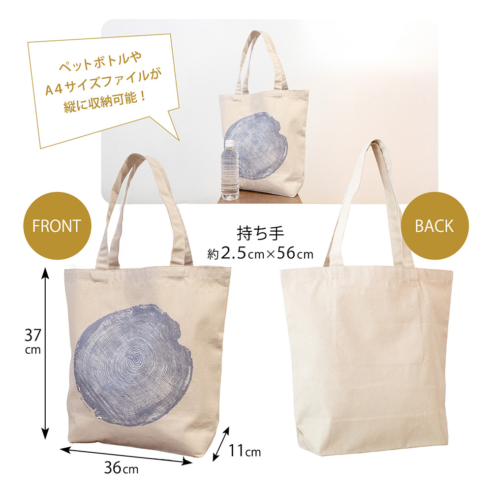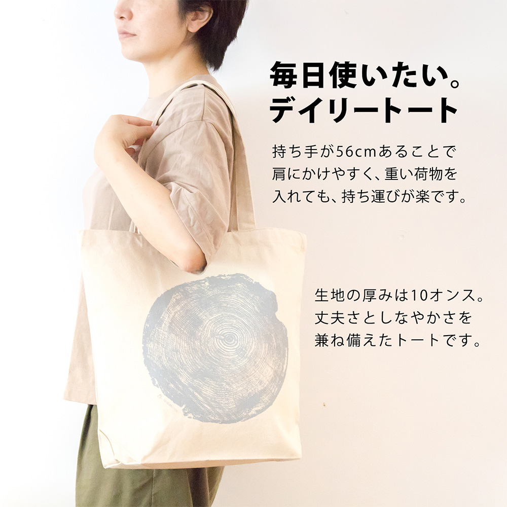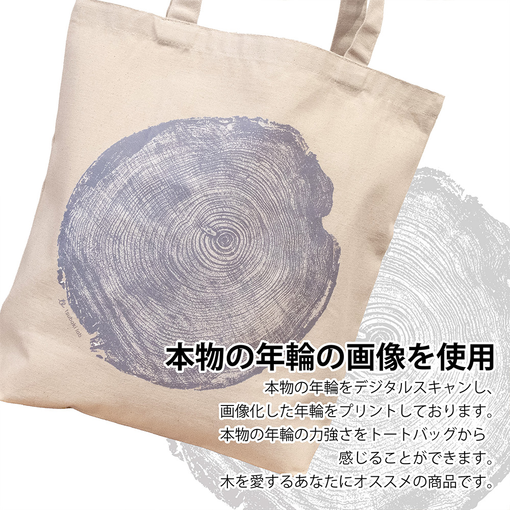 本物の年輪をデジタルスキャンし、画像化した年輪をプリントしております。本物の年輪の力強さをトートバッグから感じることができます。木を愛するあなたにオススメの商品です。