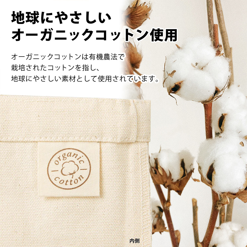 10オンスのしっかりとした生地でありながら、オーガニックコットンを使用し環境に配慮したトートバッグです。オーガニックコットンは有機農法で栽培されたコットンを指し、地球にやさしい素材として使用されています。
