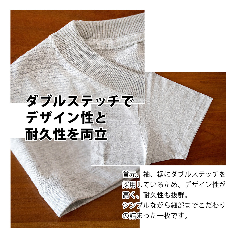 生地の厚みが5.6オンスあるしっかりしたTシャツなので、長く着ることができます。また素材に綿を90%使用しているため、着心地も非常に良いシャツとなっています。首元はダブルステッチを採用し、耐久性も抜群です。
