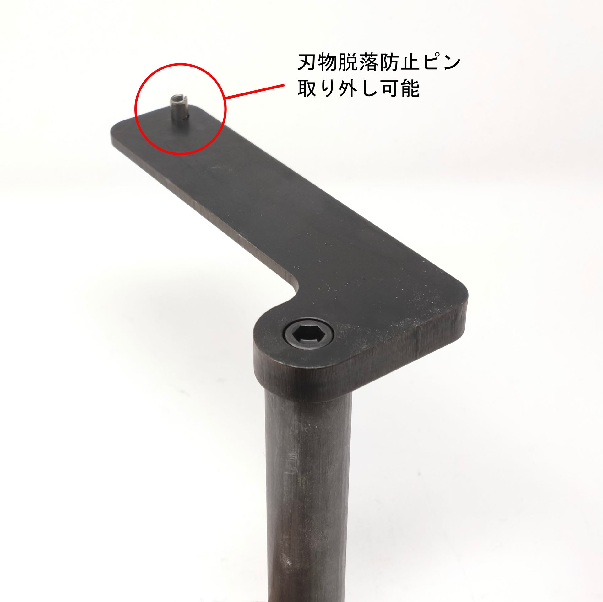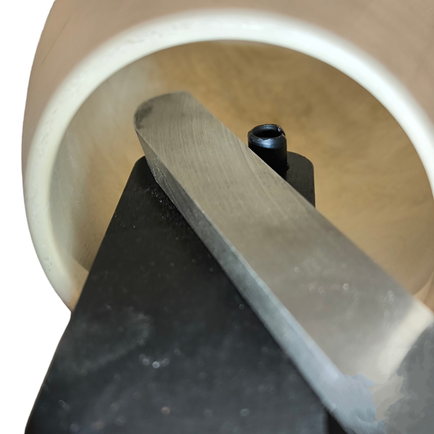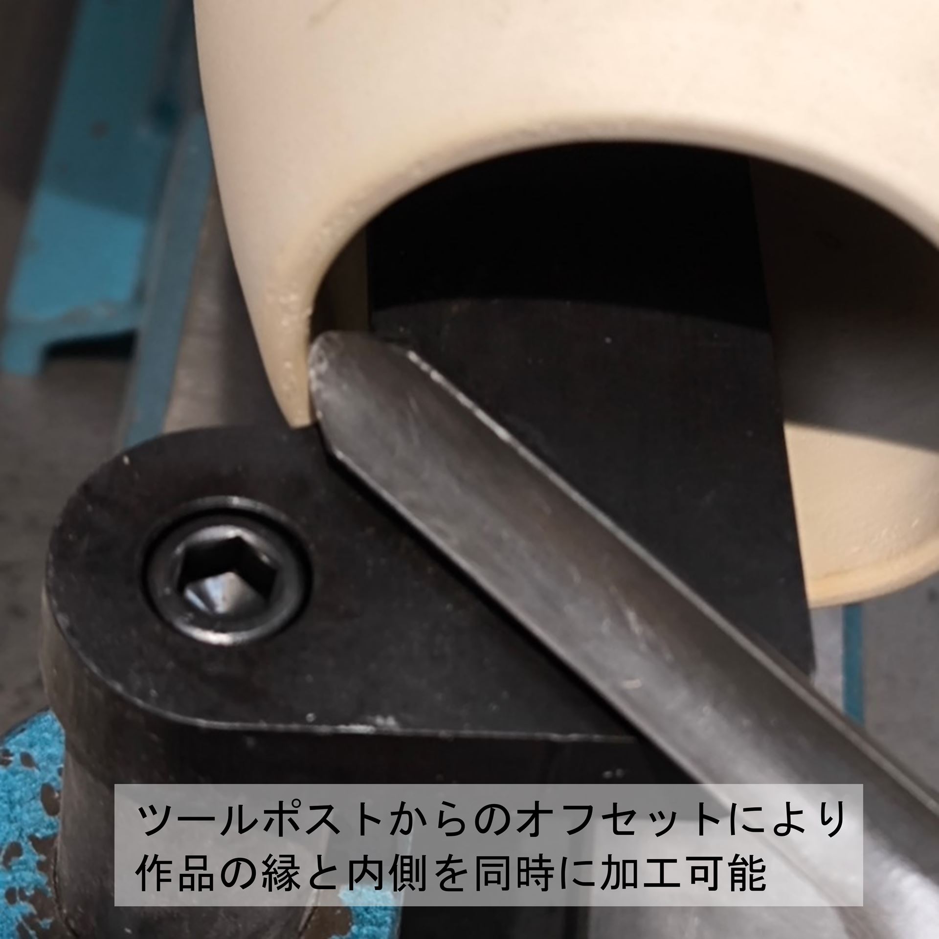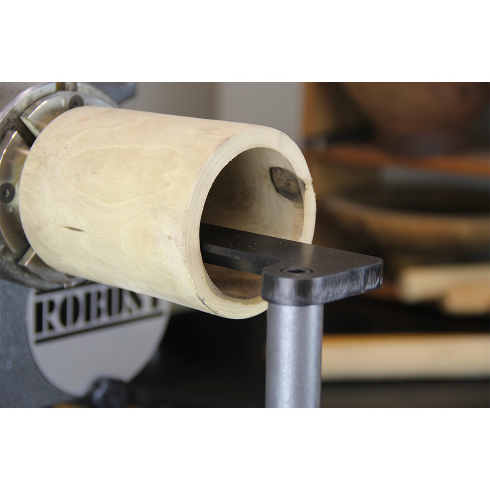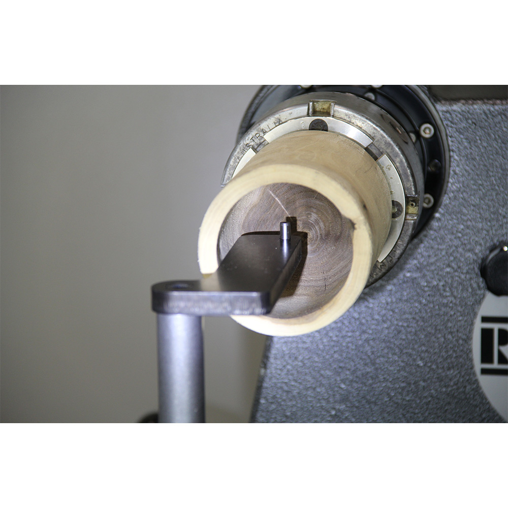 下面のエッジを斜めに削ってあるため(リリーフ加工)、ボックス・レストが作品に当たらず、より加工面に近いところに寄せることができます。さらにツールポストからオフセットされているため、作品の縁と内側を一度に加工できます。 さらには、ふいに刃物がボックス・レストから外れてしまわないよう、先端にピンが付いています。これにより安心して加工ができます。もちろんこのピンは取り外し可能です。