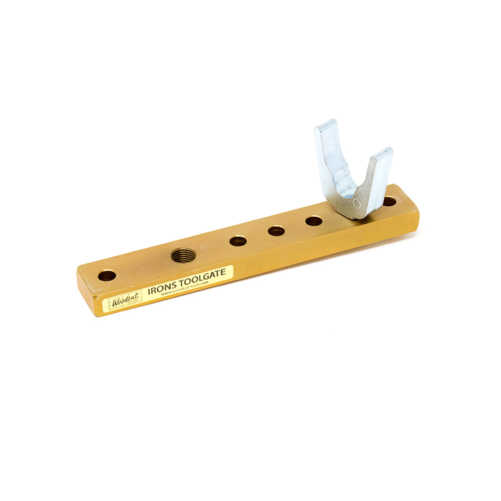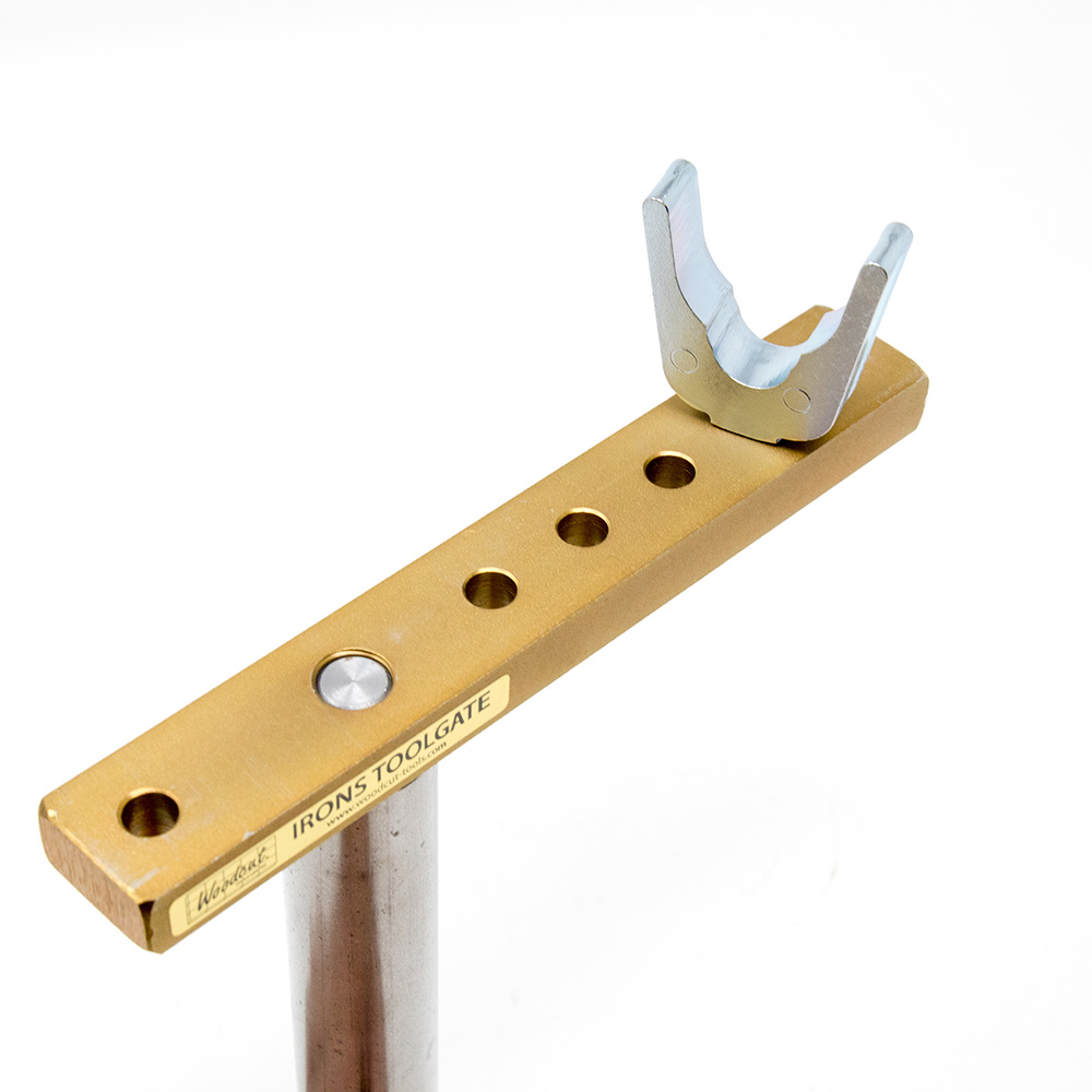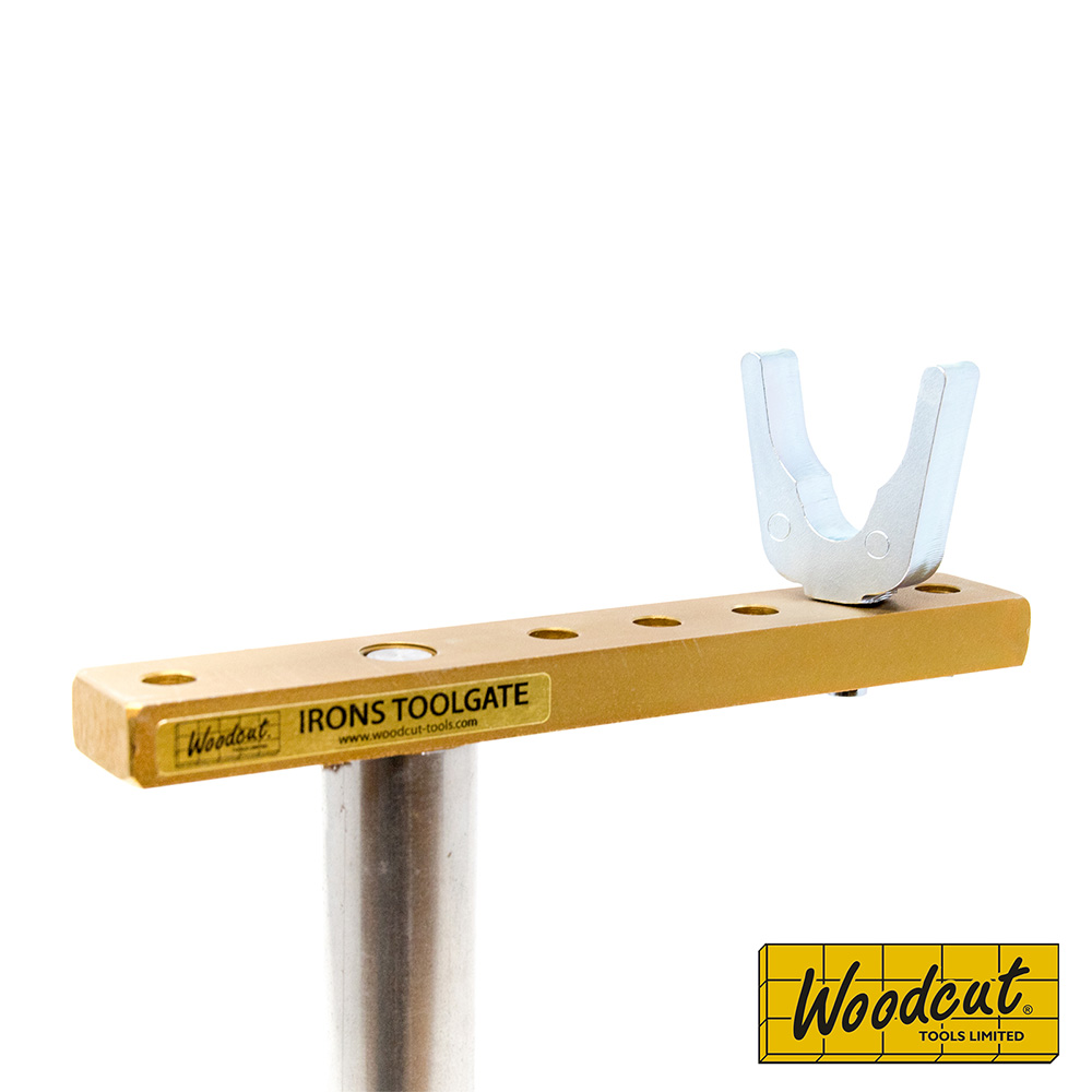 さらに、IRONS ツールゲートは、工具が横滑りするのを防ぎます。ツールレスト(Y字型のパーツ)は、1/2 ”から1 ”までの2種類のサイズに対応しており、刃物のシャフトだけでなくハンドルなどさまざまな形状、サイズのツールを載せることができます。
