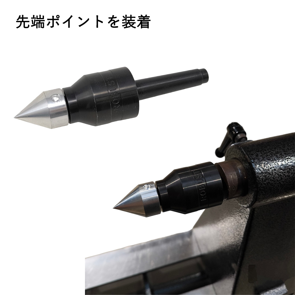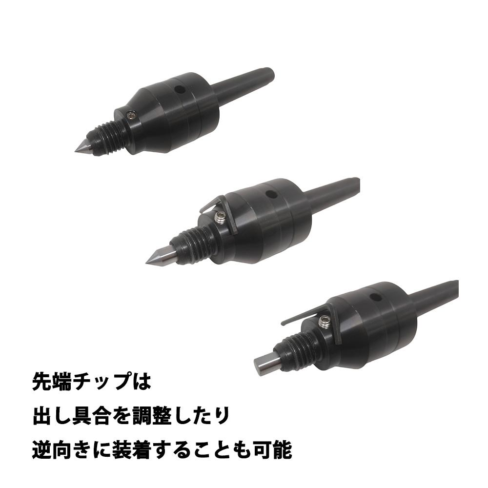 センターの先端は、付属の六角レンチを使用して必要に応じて出具合を調整できます。平らな面(とがった先端の逆側)を使用することもできます。平らな先端は、作品の底を傷つけることなくワークを支えたい場合に便利です。