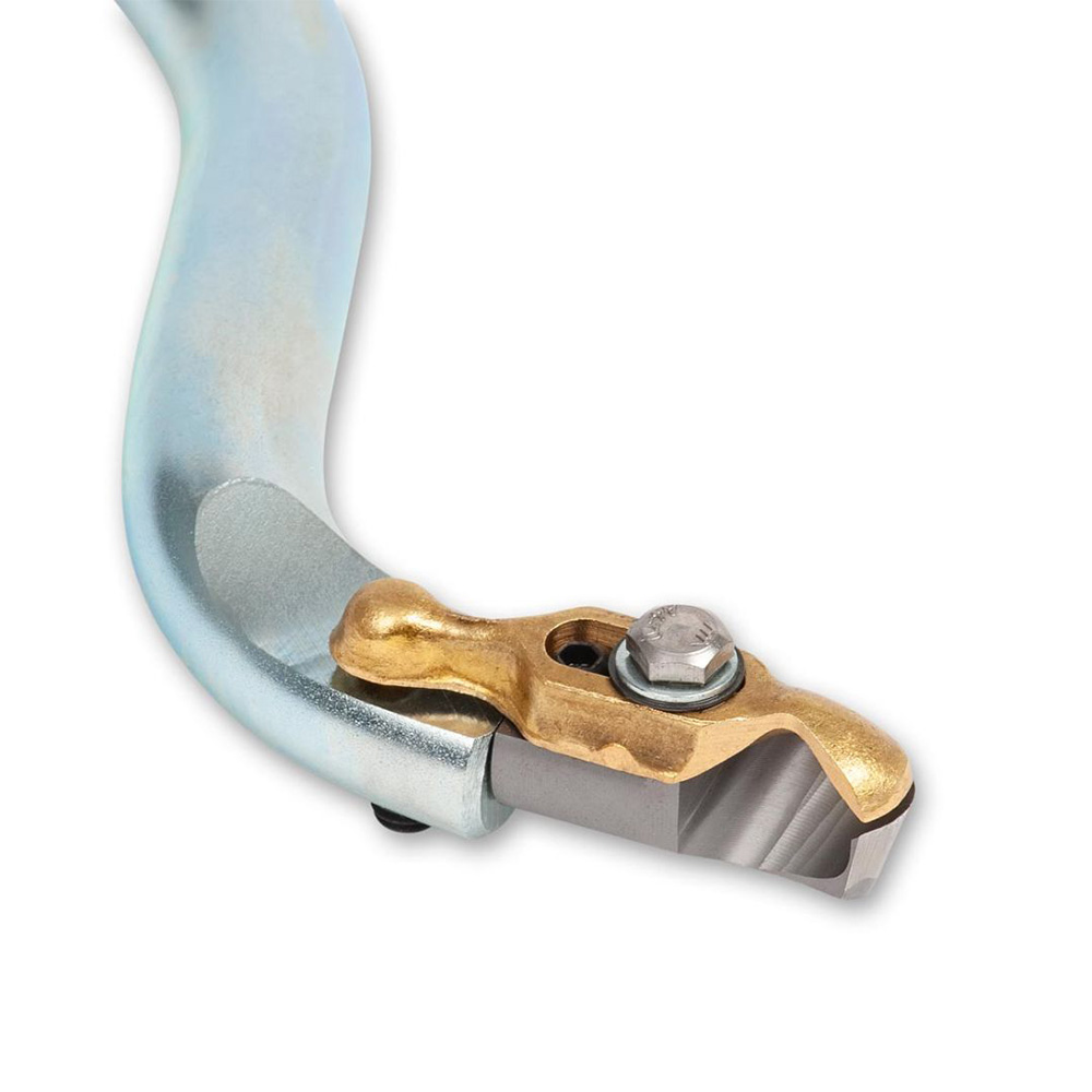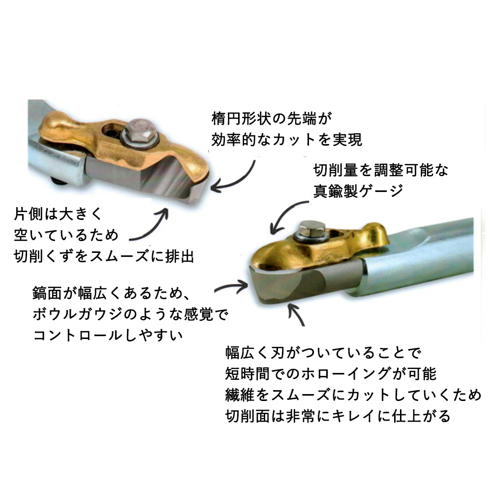 削りくずを素早く排出できるよう片側はオープンな形状になっており、深く食い込まないように、切削量も調整できる機構が備わっています。またしのぎ面が大きくあるため、ボウルガウジでベベルラビングをしているようにコントロールできます。この独自の機構により、目詰まりも起こりにくく、刃の調整時間もほとんど必要ありません。