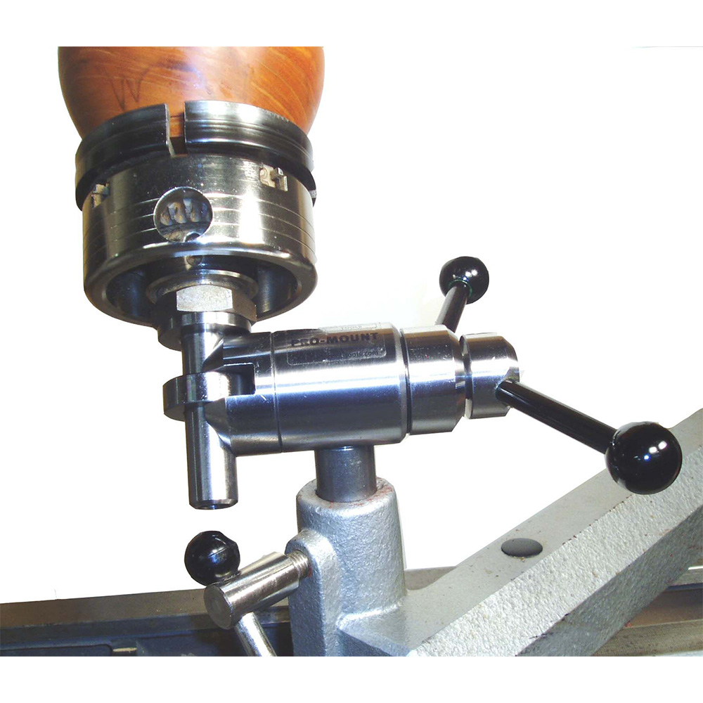 その時、手で作品を持ちながら、もう片方の手で彫刻刀などを持って作業することになりますが、このPro-Mountがあれば、旋盤で使っているチャックをそのまま使うことができます。また2本のレバーで360度自由自在に角度を変えることができ、しっかりとした固定が可能になります。さらに両手がフリーになるため、より安定した加工ができるようになります。
