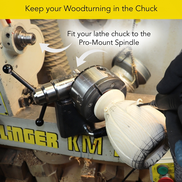 旋盤で加工したばかりの器を、木工用チャックに収めたままプロマウントに移動させ、装飾や彫刻が終わったら、そのまま旋盤に戻して加工を終わらせることができます。