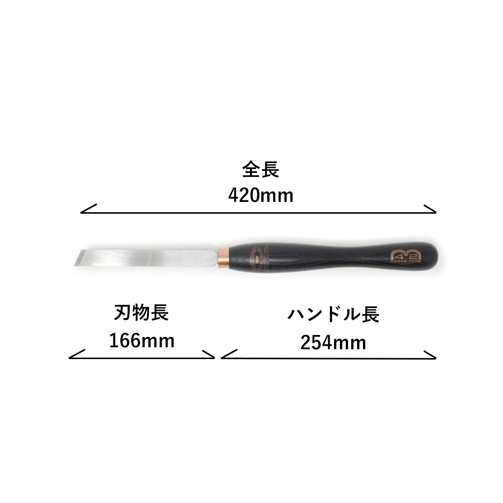 | 実寸サイズ | 刃物巾: 19mm 刃物厚: 6mm 刃物長: 166mm ハンドル長:254mm 全長: 420mm ※実寸サイズは個体によってばらつきがございます。 |