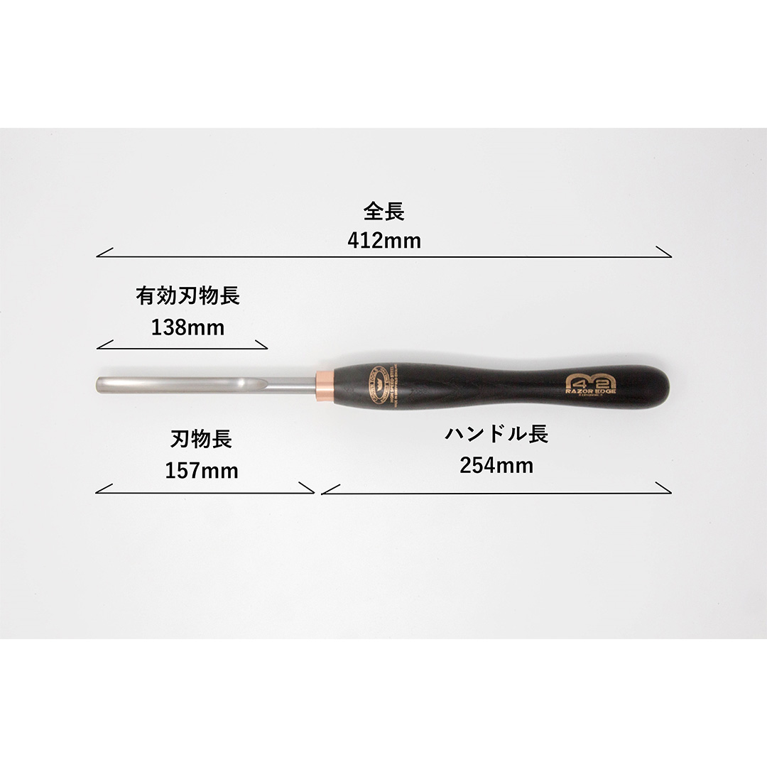 | 実寸サイズ | 刃物径: 12.4mm フルート巾:10.5mm 刃物長: 157mm (有効刃物長:138mm) ハンドル長:254mm 全長: 412mm ※有効刃物長とは、刃物長のうちの溝(フルート)の長さ ※実寸サイズは個体によってばらつきがございます。 |