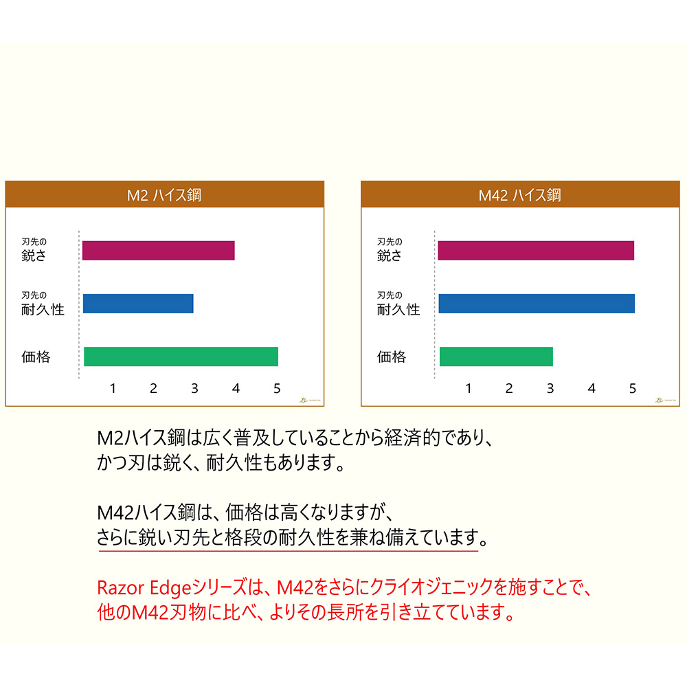 刃物の産地であるイングランド シェフィールドの老舗刃物メーカーCrown Hand Toolsが、満を持してリリースしたRazor Edgeシリーズ。一般的なM2ハイス鋼に対し、Razor Edgeシリーズではコバルト含有量を高めたM42ハイス鋼を使用。これにより耐熱性・耐摩耗性が上がります。