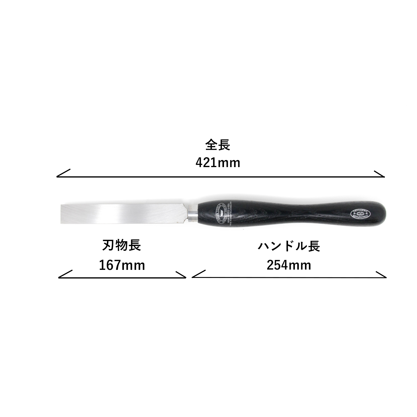 | 実寸サイズ | 刃物巾: 25.4mm 刃物厚: 6mm 刃物長: 167mm ハンドル長:254mm 全長: 421mm |
