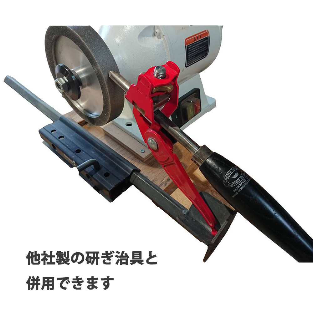 幅38mmまでの刃物を固定することができるため、大きなラフィングガウジなどもこの治具一つで研げるようになります。